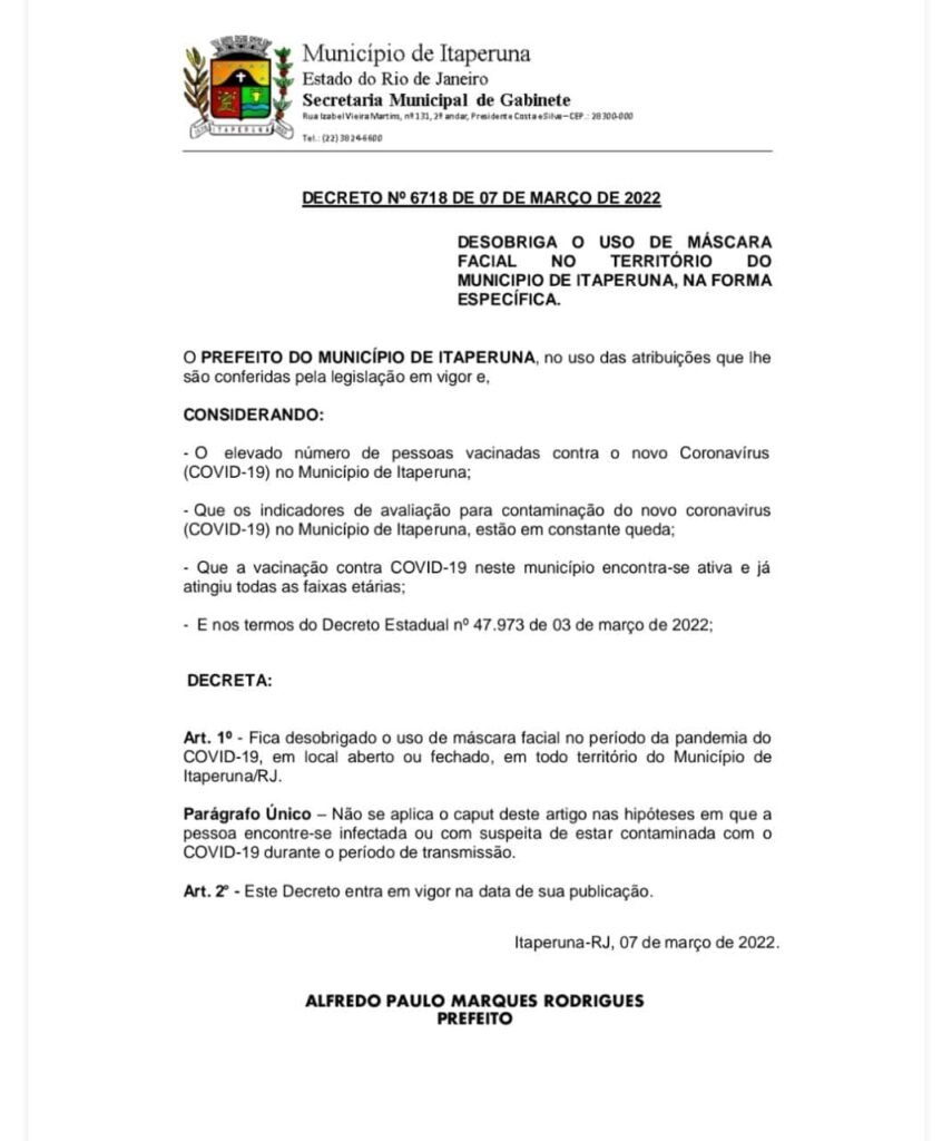 Em decreto publicado nesta segunda-feira (07), o prefeito de Itaperuna Alfredo Marques Rodrigues, passou a desobrigar o uso de máscaras faciais ou locais abertos ou fechados em todo o município. A medida já está valendo e segue decisão estadual da semana passada, que deixou a escolha a critério dos gestores municipais.