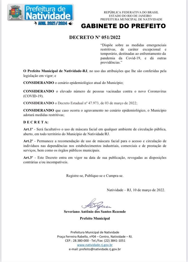 Em decreto publicado nesta quinta-feira (10), o prefeito de Natividade retirou a obrigatoriedade do uso de máscaras faciais em todo o território municipal. No documento, ele, contudo, mantém a RECOMENDAÇÃO (que é diferente de obrigação), para que o seu uso permaneça nas dependências de estabelecimentos comerciais ou repartições públicas.