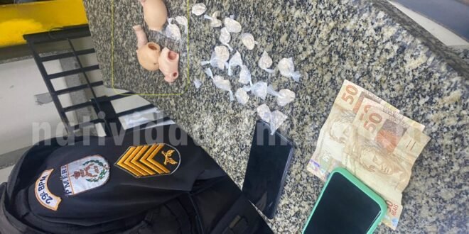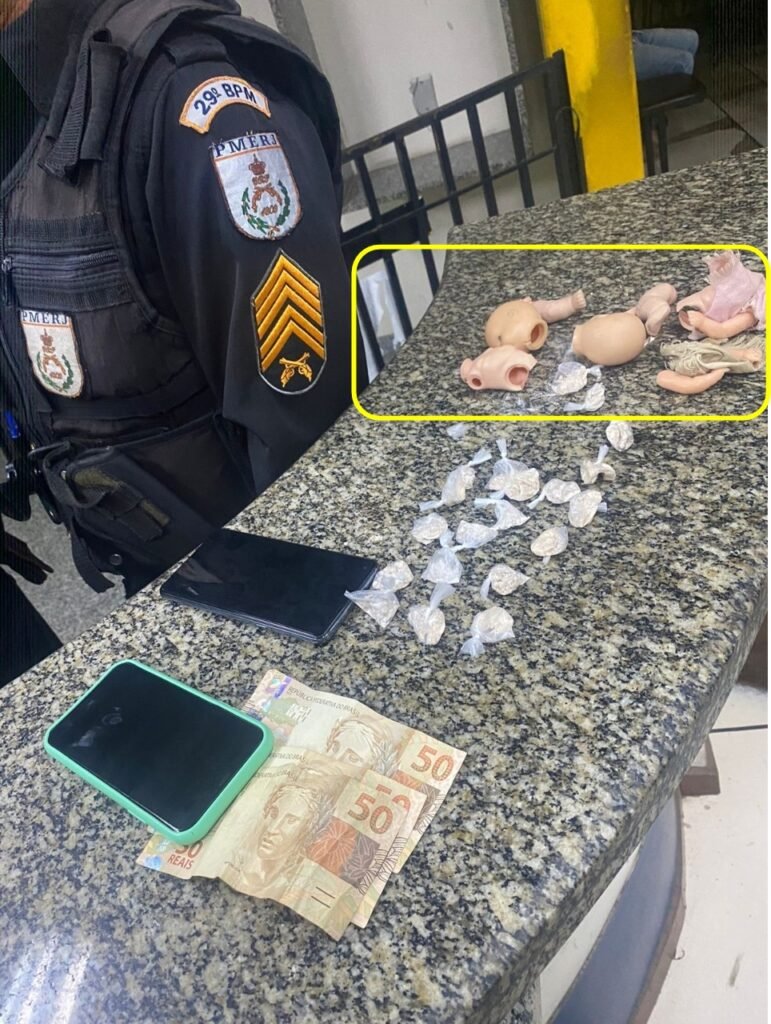 Após buscas pelo no veículo, os agentes encontraram 20 papelotes de cocaína, escondidos no interior de duas bonecas das crianças, além de terem apreendido celulares e R$ 150.
