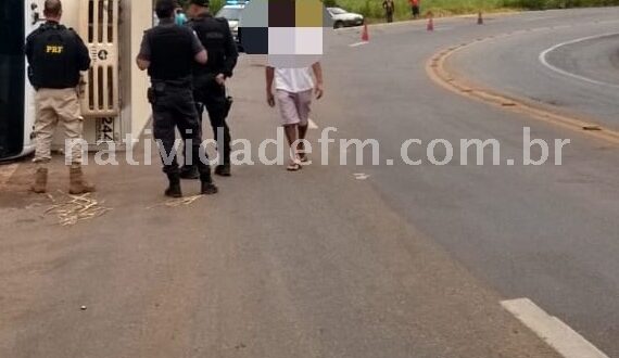 A Polícia Rodoviária Federal preserva a carga de carne. O veículo é de Visconde do Rio Branco/MG e segundo informações colhidas no local, seria da mesma empresa da carreta que tombou no mesmo lugar no dia 17 de fevereiro último.