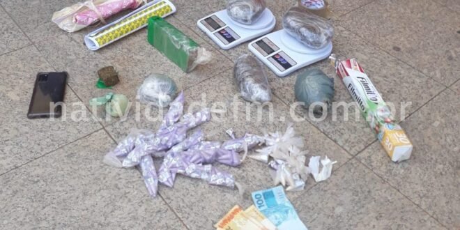 Eles acabaram abordados instantes depois de posse de um dos tabletes de maconha, celular além de R$ 164 e onde haviam estado, foram aprendidas duas balanças de precisão, diversos materiais para endolação, mais drogas, totalizando 1.274 gramas de maconha e 113 de cocaína.