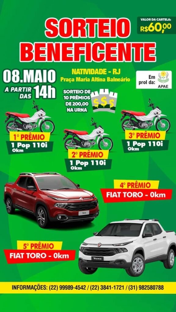 Reserve sua cartela e colabore com a APAE/Natividade. Mande um ZAP para (22) 9 99838-9267 (Josilene).