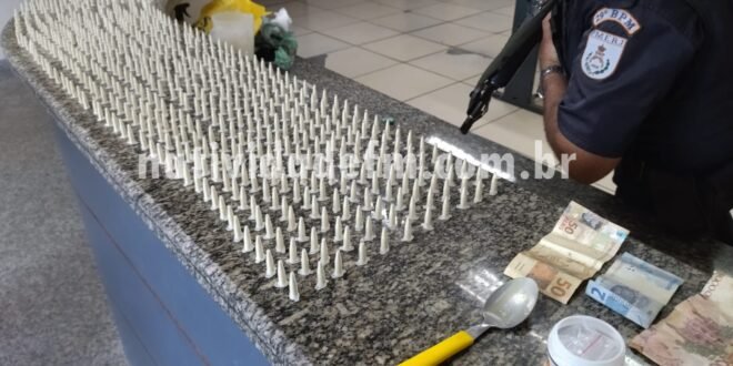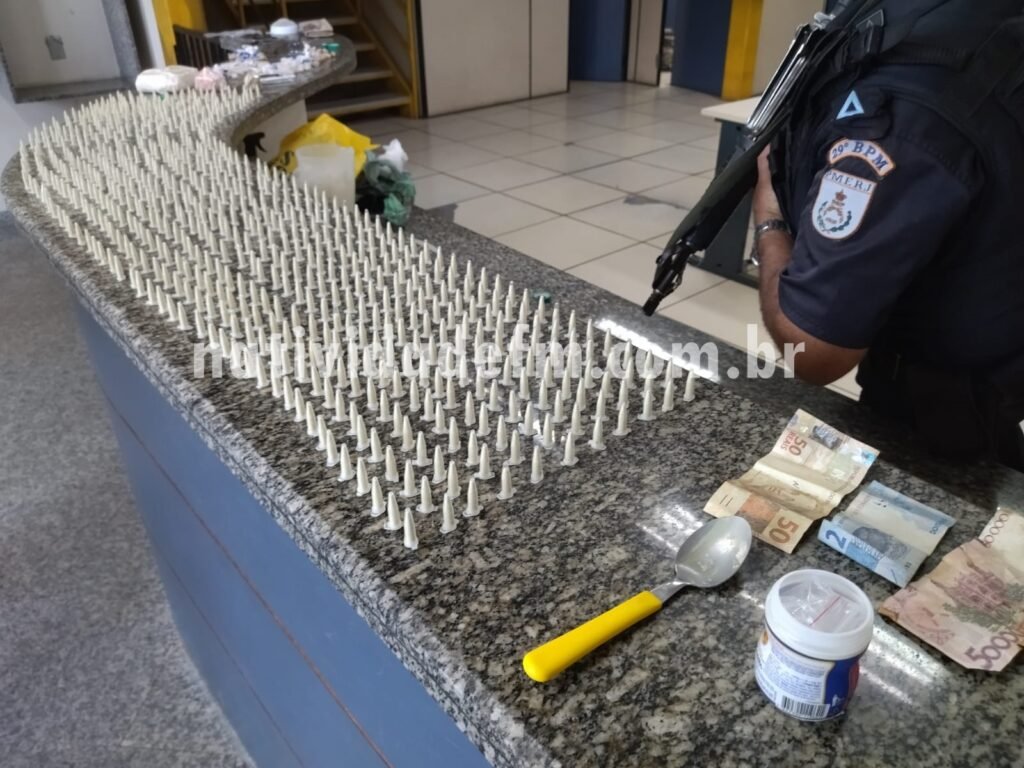 De posse de mandado expedido pela Justiça, equipes do 29º BPM se deslocaram até a Rua Carlos Alberto Barreto Jóia e inicialmente abordaram Romualdo Macedo Santos, de 33 anos e outras cinco pessoas que se encontravam no interior da casa de número 06, onde após buscas apreenderam escondidos no telhado quase 700 pinos e 60 sacolés de cocaína, porções da mesma droga ainda em tabletes, caderno de anotações, balança de precisão, cerca de 400 pinos vazios, material para endolação, fermento em pó usado para misturar na droga, além de utensílios com vestígios do material. Os agentes ainda aprenderam R$ 52 e três pequenos tabletes de maconha, escondidos em um treiler próximo.