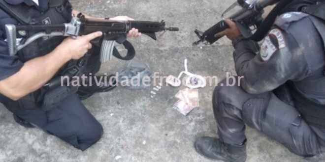 Ninguém chegou a ser atingido, mas o traficante, que chegou a ser identificado, conseguiu fugir, abandonando a sacola que levava e no interior da qual estavam cinco buchas de maconha, 10 pinos de cocaína, uma munição Cal. .45, R$57,00 espécie, balança de precisão e material de endolação.