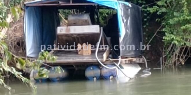 Com apoio de policiais ambientais da 3ª UPAm/Desengano, guardas civis ambientais de Natividade, deflagraram nesta terça-feira (12), operação para coibir o garimpo clandestino. Após monitoramento, as equipes se deslocaram até altura da localidade de Bananeiras, onde se depararam com uma balsa ancorada às margens do Rio Carangola.