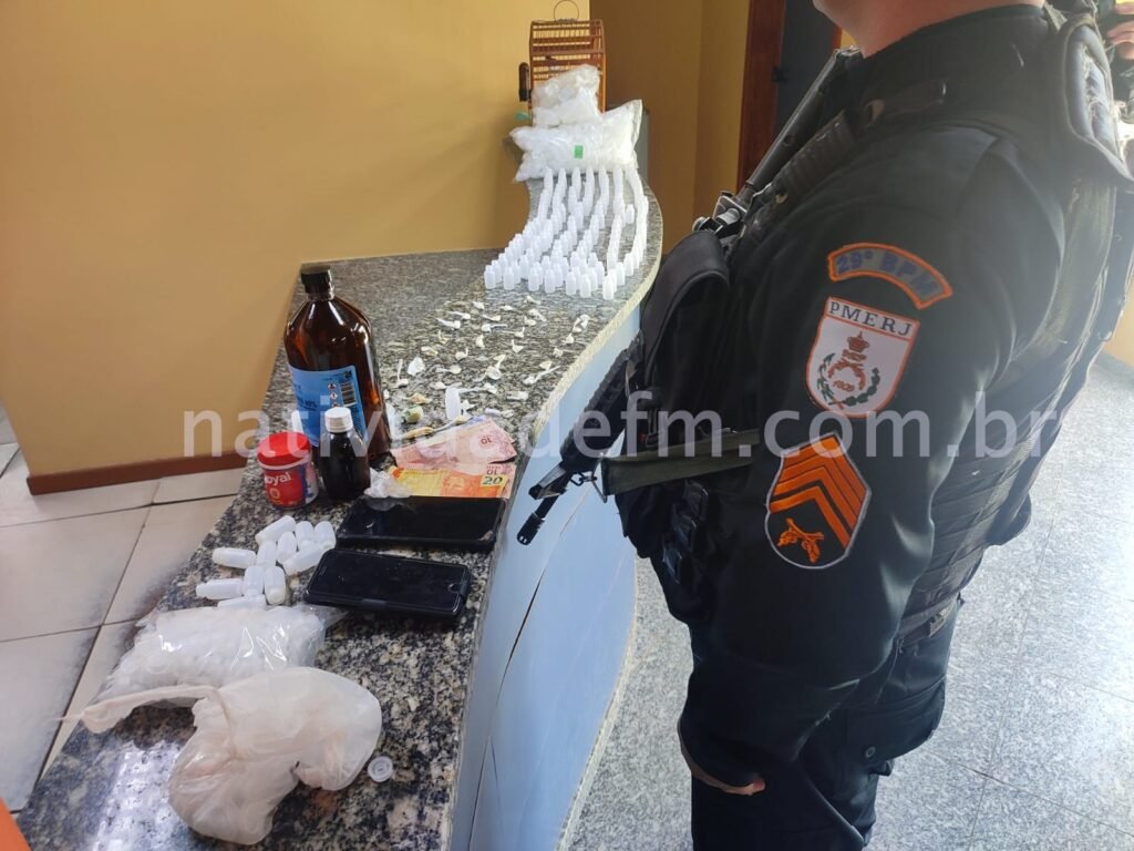 Um suspeito de tráfico de drogas foi preso durante cumprimento de mandado de busca na manhã desta quinta-feira (18), no Morro do Cristo Rei, Porciúncula. Equipes do 29º BPM seguiram para o local que já estava sendo alvo de monitoramento, onde se depararam com um suspeito, que ainda tentou se livrar, sem êxito, da droga que mantinha no interior do imóvel, a dispensando no vaso sanitário.