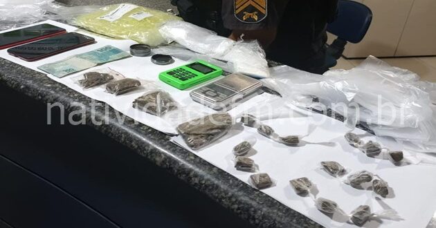 Depois de vasculhares o interior do residência que fica na Rua Cabo Jair Moura, militares do 29º BPM, encontraram farto material para endolação – 556 sacolés e cerca de mil pinos vazios – balança de precisão, celulares, máquina de cartão, R$ 100, 15 buchas e outros quatro pedaços, totalizando 106 gramas de maconha.