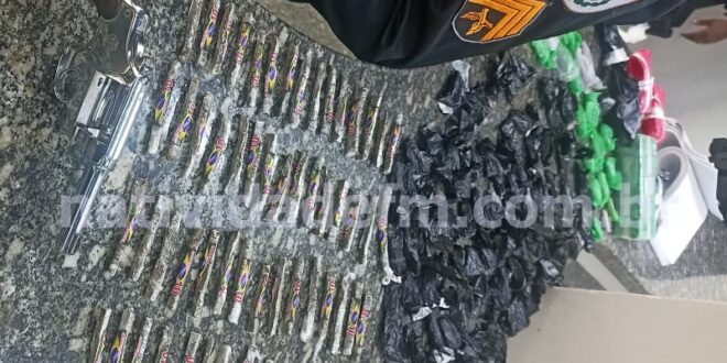Militares do 36º BPM realizaram incursão no local, onde cumpriram mandado de busca na casa do suspeito, onde localizaram o revólver calibre 32 Smith e Wesson desmuniciado, 61 tiras de maconha, 101 pinos de cocaína, aproximadamente 120 folhas A4 impressas e aproximadamente 7 mil sacolinhas vazias, usadas para embalar entorpecentes.