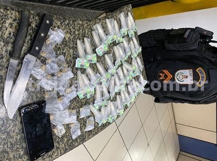 Durante ação de rotina, os agentes abordaram o GM Prisma na Rua Silva Jardim, encontrando com uma mulher de 23 anos, que seguia no banco de passageiro, 18 pedras de crack, que levava não mãos, além de 40 pinos de cocaína, escondidos sob o vestido.