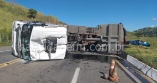Uma carreta com placa de Santa Luzia/MG, carregada com carvão mineral, tombou na altura do km 64 da BR 356, entre Italva e Itaperuna, local conhecido como ‘Curva do Homero’, na manhã desta sexta-feira (29). A carreta chegou a atingir um Chevrolet Onix, que foi jogado para fora da pista. Nos veículos estavam somente seus respectivos motoristas que não sofreram …