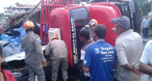 Caminhão tomba sobre automóvel no Centro de Bom Jesus do Itabapoana