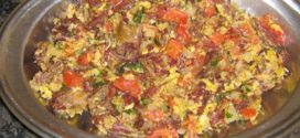INGREDIENTES: 1/2 kg de carne seca magra 1 tomate grande picadinho 1 cebola média picadinha Coentro a gosto picadinho Azeite para refogar 1 ovo Um pouco de colorífico vermelho MODO DE PREPARO: Escalde a carne seca pelo menos 3 vezes para dessalgar Depois coloque para cozinhar na panela de pressão com água suficiente para cobri-la, por uns 15 minutos (conte …