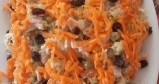 INGREDIENTES: 2 cenouras cozidas e picadas/raladas 1/2 xícara de uvas passas 1 lata de milho verde 200 g de presunto picado 1 xícara de frango desfiado, se for assado antes fica mais gostoso 1 maçã verde picada 1/2 pote grande de maionese MODO DE PREPARO: Em um refratário, misture todos os ingredientes